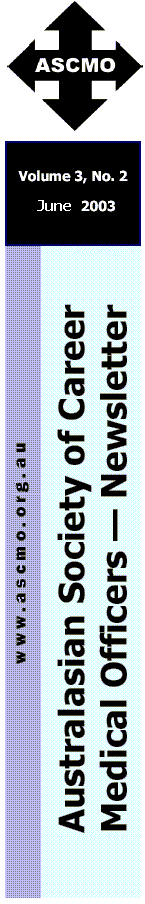 Renewals: It's renewal time again for members whose memberships expire at the end of June 2003. Renewal notices for these members are enclosed along with this newsletter. Next Meeting ASCMO's next meeting is at 7pm on Thurs 12th June 2003. It will be hosted at the Tweed Hospital allowing other to join us via ASCMO's Freecall teleconference number. Senior members of the Medical Training and Education Council of NSW (MTEC) will be joining us at 7pm to discuss ongoing training opportunities (or lack thereof) for CMOs. To join our meeting by phone: simply ring freecall 1800 672 949 at 7pm sharp, entering our Account number = 7213 8528 followed by our pin number: 8950 then the "#" key. You will either join us or be listening to music till others join. (for further details contact David Brock 0412 065 775) ASCMO's Industrial activities: ASCMO continues to ask for industrial representation before the NSW Industrial Commission to bring forward a renewed Award for CMOs in NSW. Following the Nurses decision, we are waiting for ASMOF to obtain legal advice to challenge the no extra claims provision associated with current series of pay rises in NSW due for completion in July 2004 Continuing Medical Education for CMOs: The Continuing Professional Development Programme (CPDP) is a Continuing Medical Education program developed by the Royal College of Pathologists of Australasia (RCPA). This innovative program is based on self-directed learning through the documentation of educational activities in a Learning Diary. The great advantage to CMOs is that CPDP is easy, user friendly and logs those aspects of your own practice that provide a significant educational event. The CPDP allows you to note down your educational experiences and, at the end of each six-month period, the results are officially tabulated and reported by ASCMO. This report is the certifiable evidence of your own CME and is acceptable as such throughout Australia. The facility also exists for you to log on at work as well as home, and also to compose your own reports from the data that you collect. ASCMO is able to offer this log-book style program to members of ASCMO both in electronic (Windows ONLY) and manual forms. The cost is $55-00 annually for the electronic version and $110-00 annually for the paper version. Further details of this programme are available at www.ascmo.org.au/edu/cpdp.htm For current members of CPDP please forward your diary submissions to our Education Officer:- Dr Gabrielle du Preez-Wilkinson 6 Mary Street REDCLIFFE QLD 4020 Submissions should be forwarded to Gabrielle twice a year, i.e. June and December. All participants in this program will receive relevant certifications. This can be used as evidence of CME, to your employer, when re-registering with the Medical Board of NSW, etc. Certificates are usually issued in September each year. If you require your certificate sooner, please advise either Gabrielle or the ASCMO Office Manager. |